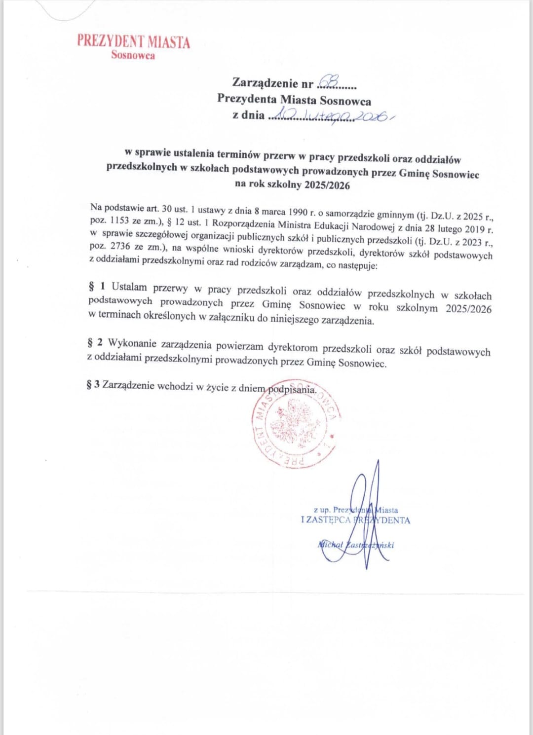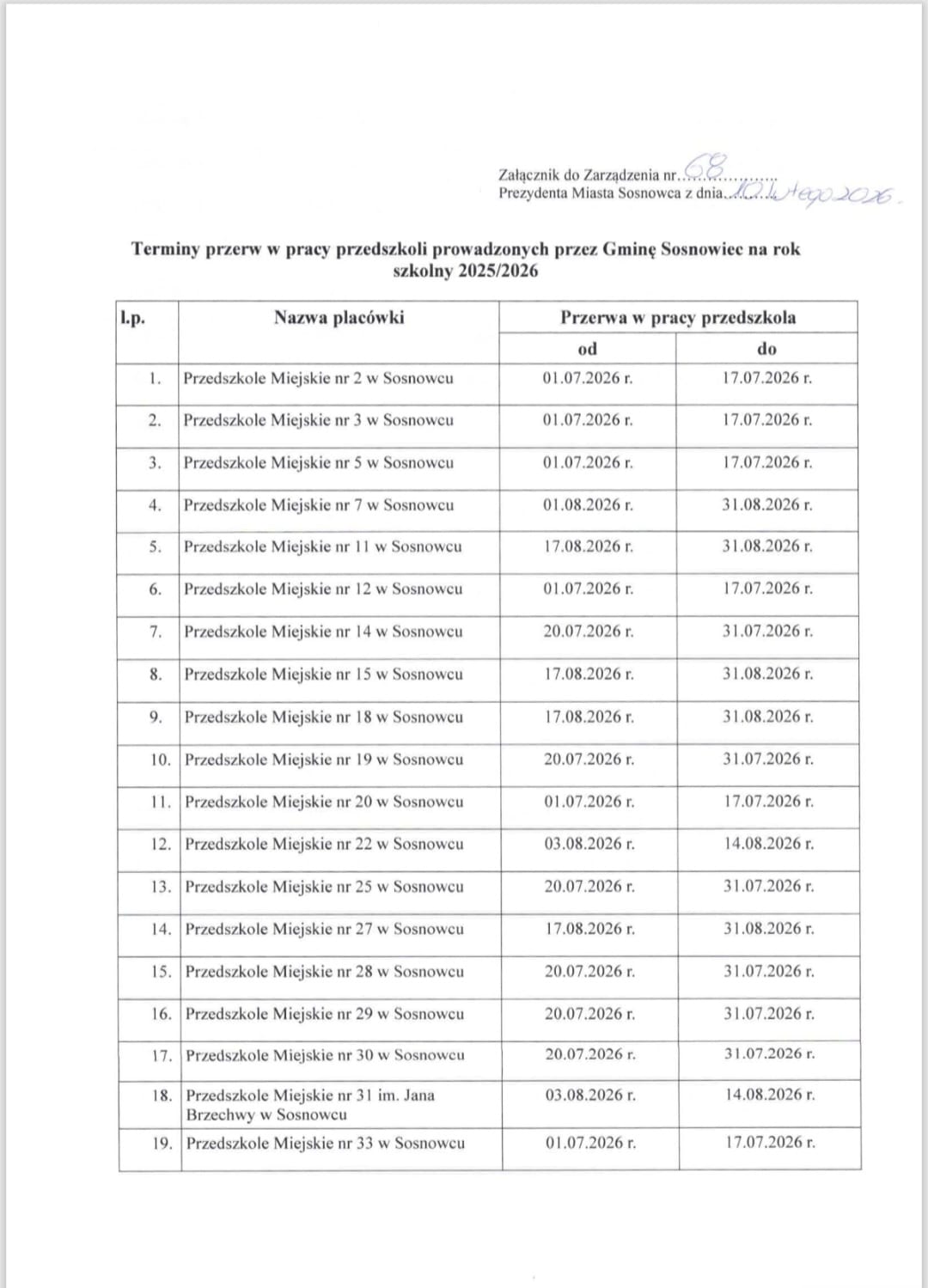 w załączeniu Zarządzenie Prezydenta Miasta Sosnowca w sprawie terminów rekrutacji na rok szkolny 2025/2026
